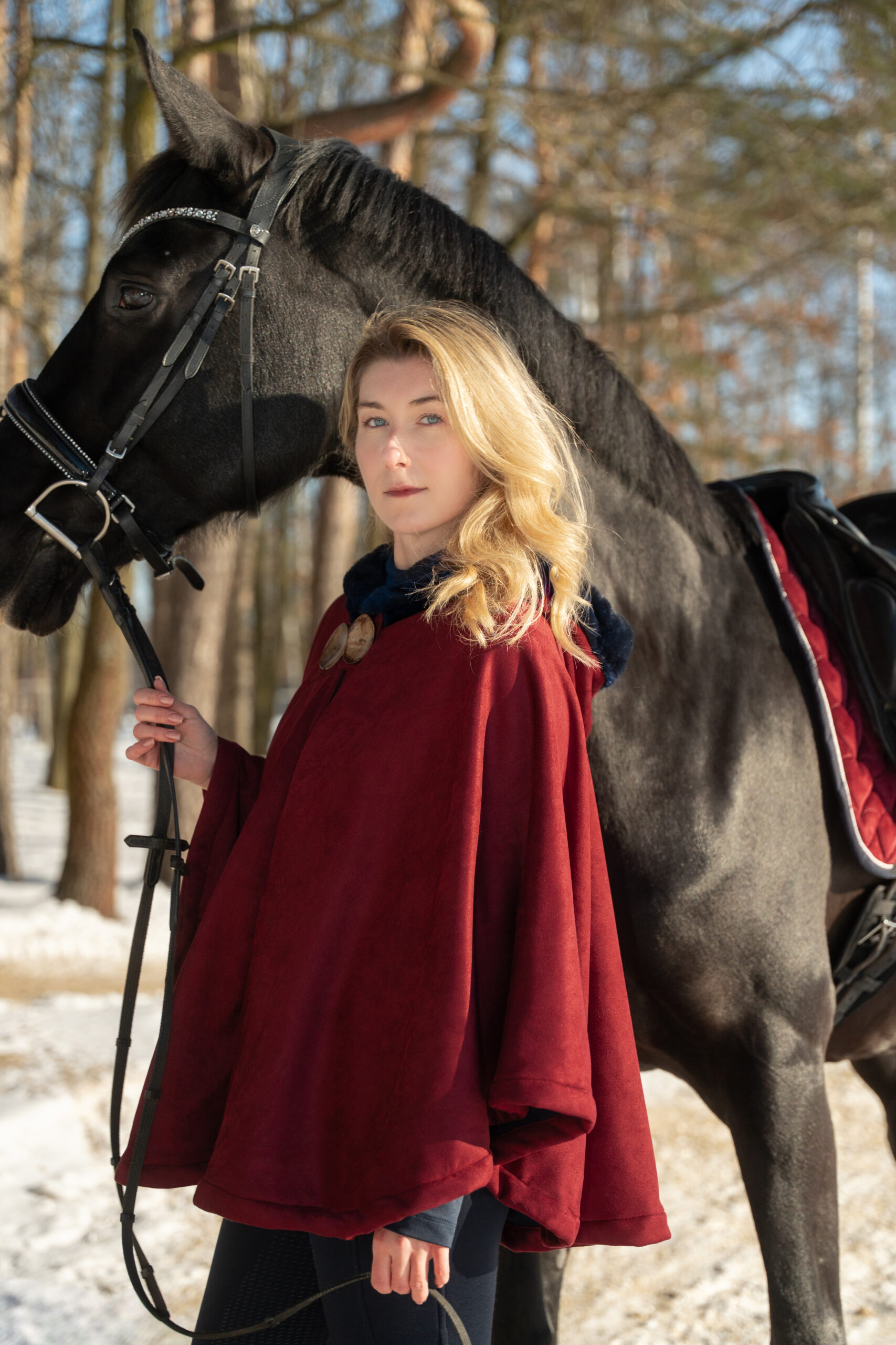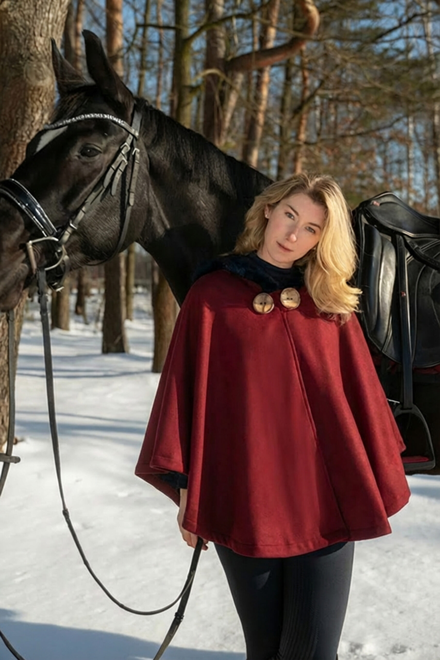 - Luksusowy Materiał: Zewnętrzna warstwa to mięsisty, aksamitny w dotyku zamsz (95% wysokiej jakości poliester, 5% spandex), który doskonale się układa i nie gniecie się. Od wewnątrz ponczo podszyte jest miękkim polarem, gwarantującym ciepło i przytulność.