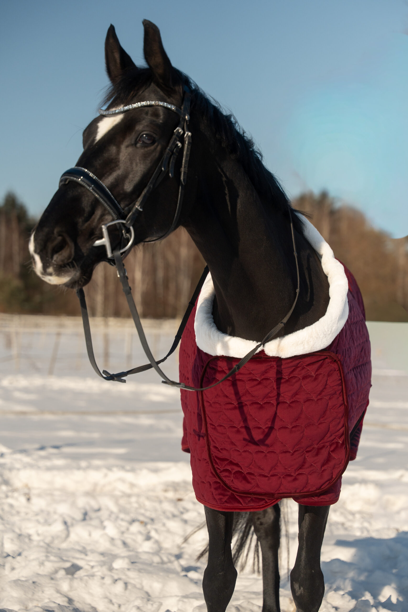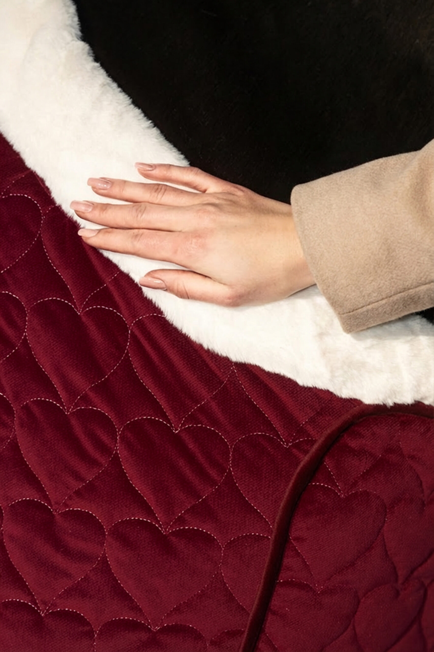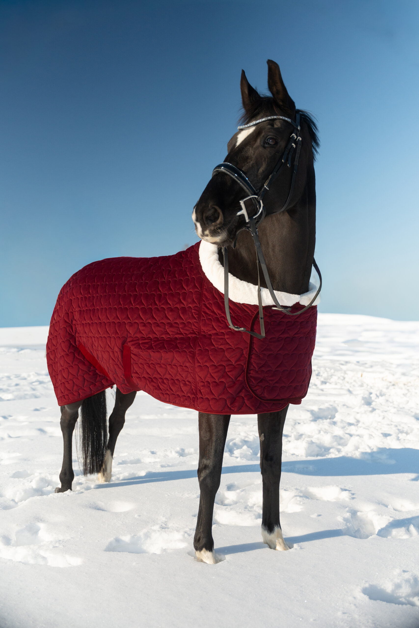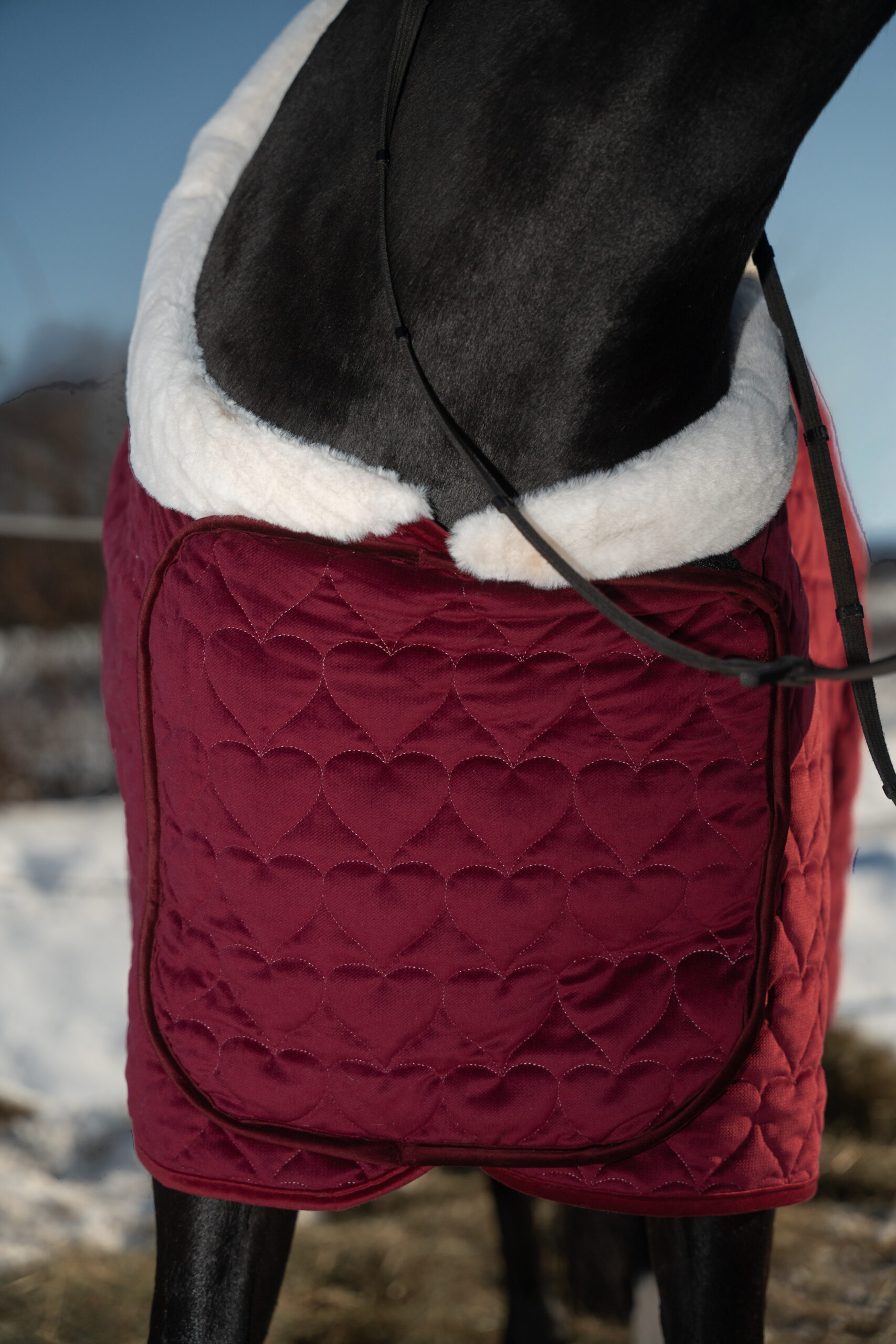 Pozwól swojemu koniowi poczuć komfort i luksus, na jaki zasługuje. HeartBeat to bordowa derka stajenna, która łączy elegancję najwyższej klasy z funkcjonalnością stworzoną z myślą o codziennym użytkowaniu w stajni. Pikowanie w serca w połączeniu z miękkim welvetem o delikatnej strukturze cegiełek tworzy subtelny, a zarazem wyrafinowany efekt, który wyróżnia Twój koń w każdej stajni.