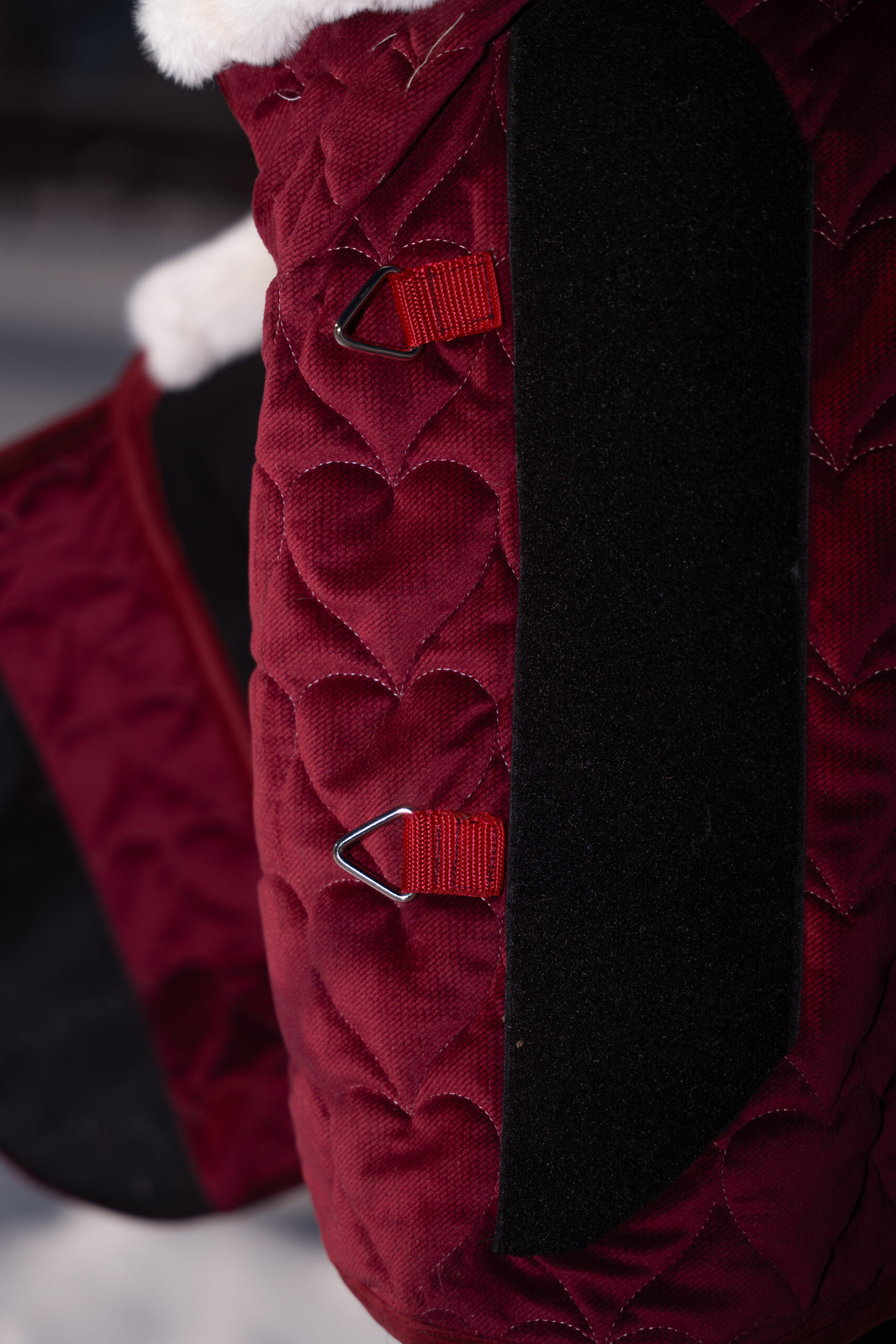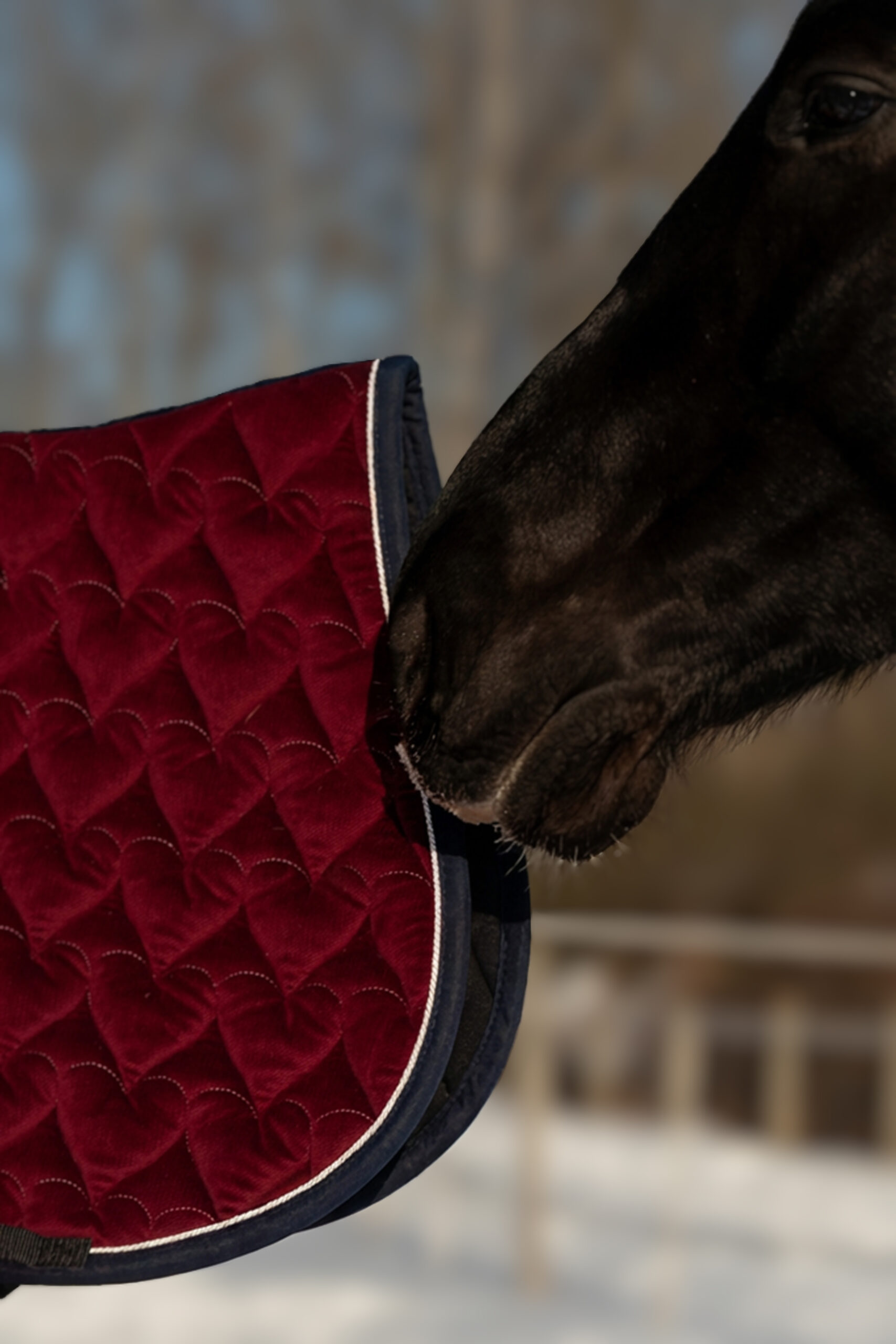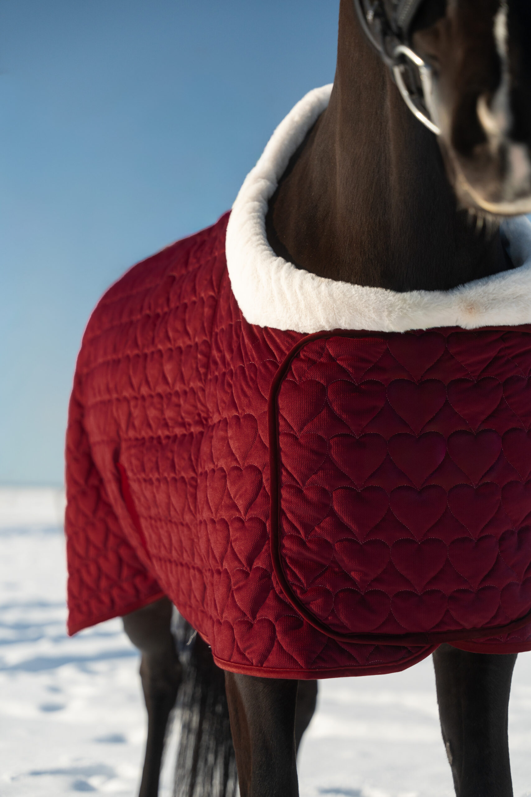 Pozwól swojemu koniowi poczuć komfort i luksus, na jaki zasługuje. HeartBeat to bordowa derka stajenna, która łączy elegancję najwyższej klasy z funkcjonalnością stworzoną z myślą o codziennym użytkowaniu w stajni. Pikowanie w serca w połączeniu z miękkim welvetem o delikatnej strukturze cegiełek tworzy subtelny, a zarazem wyrafinowany efekt, który wyróżnia Twój koń w każdej stajni.