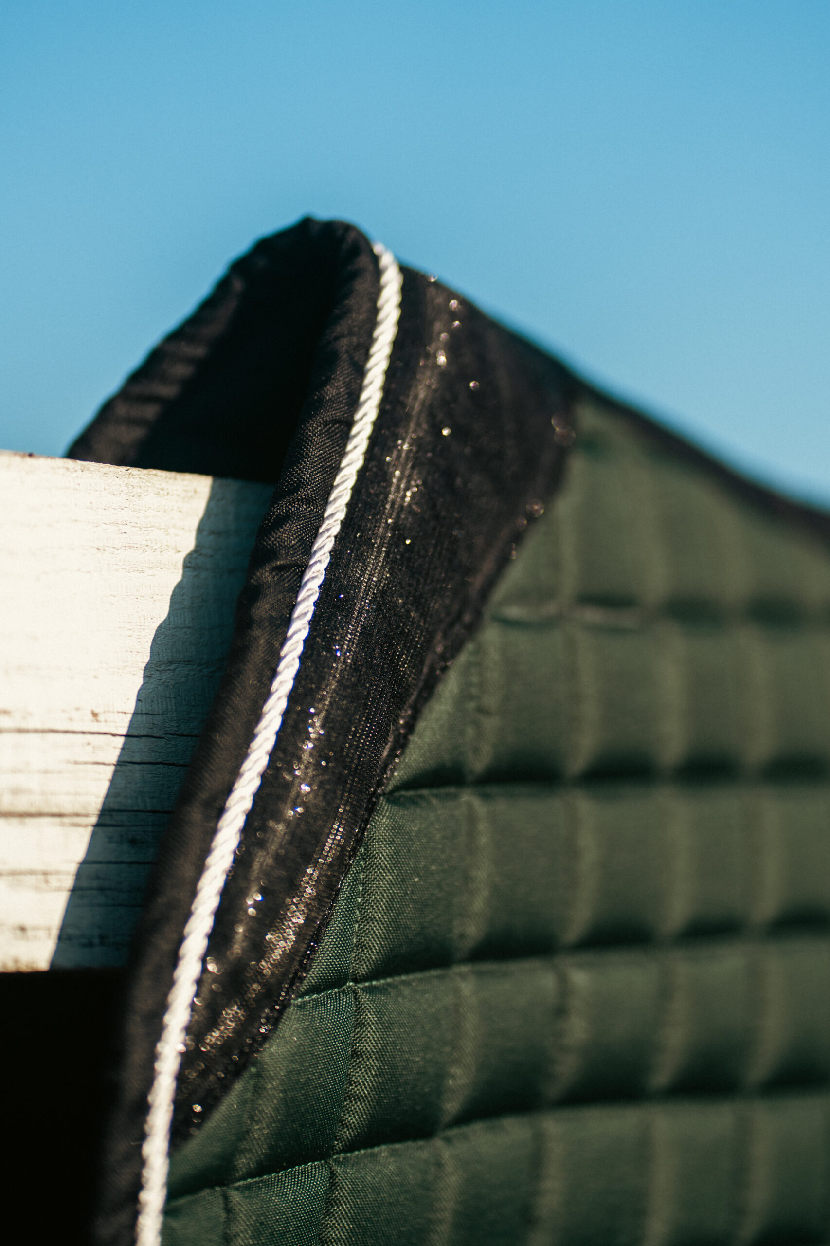 - Stylowy Wygląd: Matowa zewnętrzna tkanina z czarnymi brokatowymi wstawkami sprawia, że czaprak Elin przyciąga wzrok i dodaje elegancji. To idealny wybór dla jeźdźców, którzy pragną wyróżniać się na każdym treningu czy zawodach.