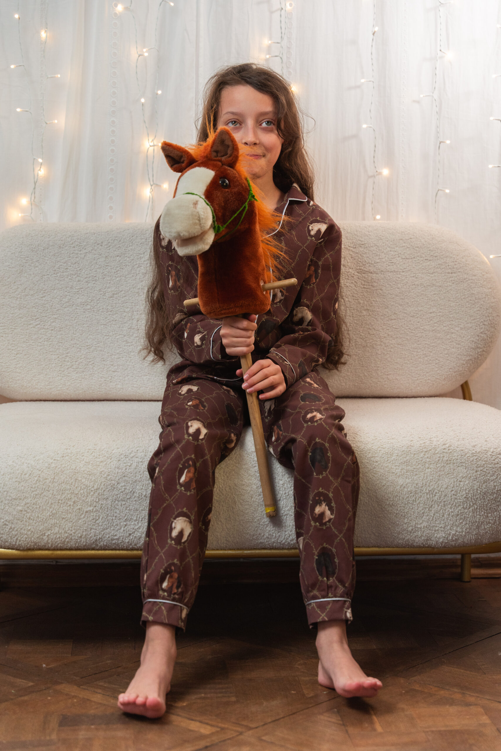 To klasyczny komplet: koszula z kołnierzykiem i długim rękawem oraz spodnie z długą nogawką. Dzięki eleganckiemu krojowi i srebrnej satynowej wypustce dzieci wyglądają w niej jak mali dżentelmeni i małe amazonki – ale nadal mogą swobodnie biegać po domu, wskakiwać na kanapę i zasypiać z ulubionym pluszowym koniem.