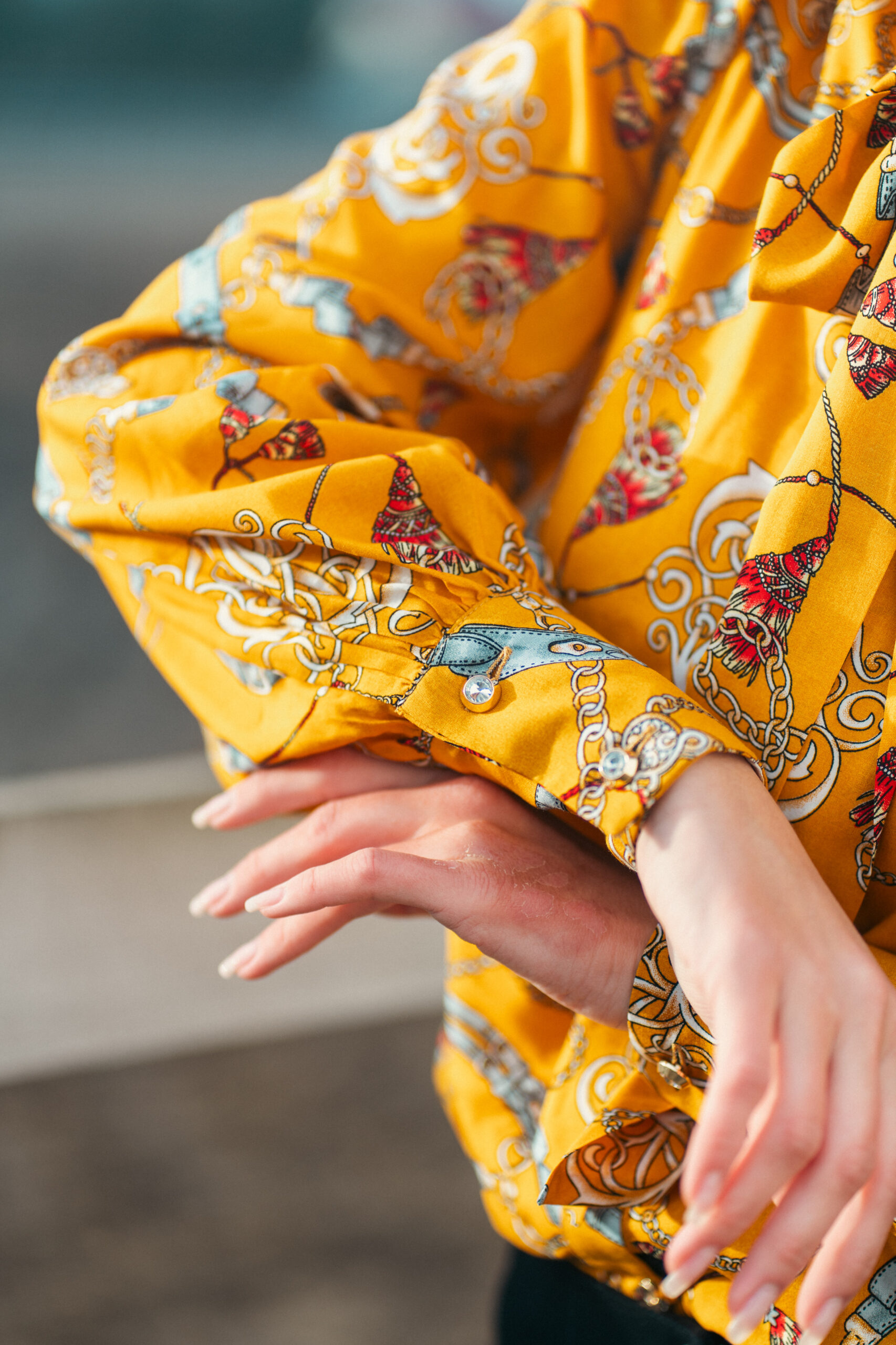 Eleganckie mankiety zapinane na ozdobne guziki nadają całości wyrafinowanego, kobiecego charakteru.